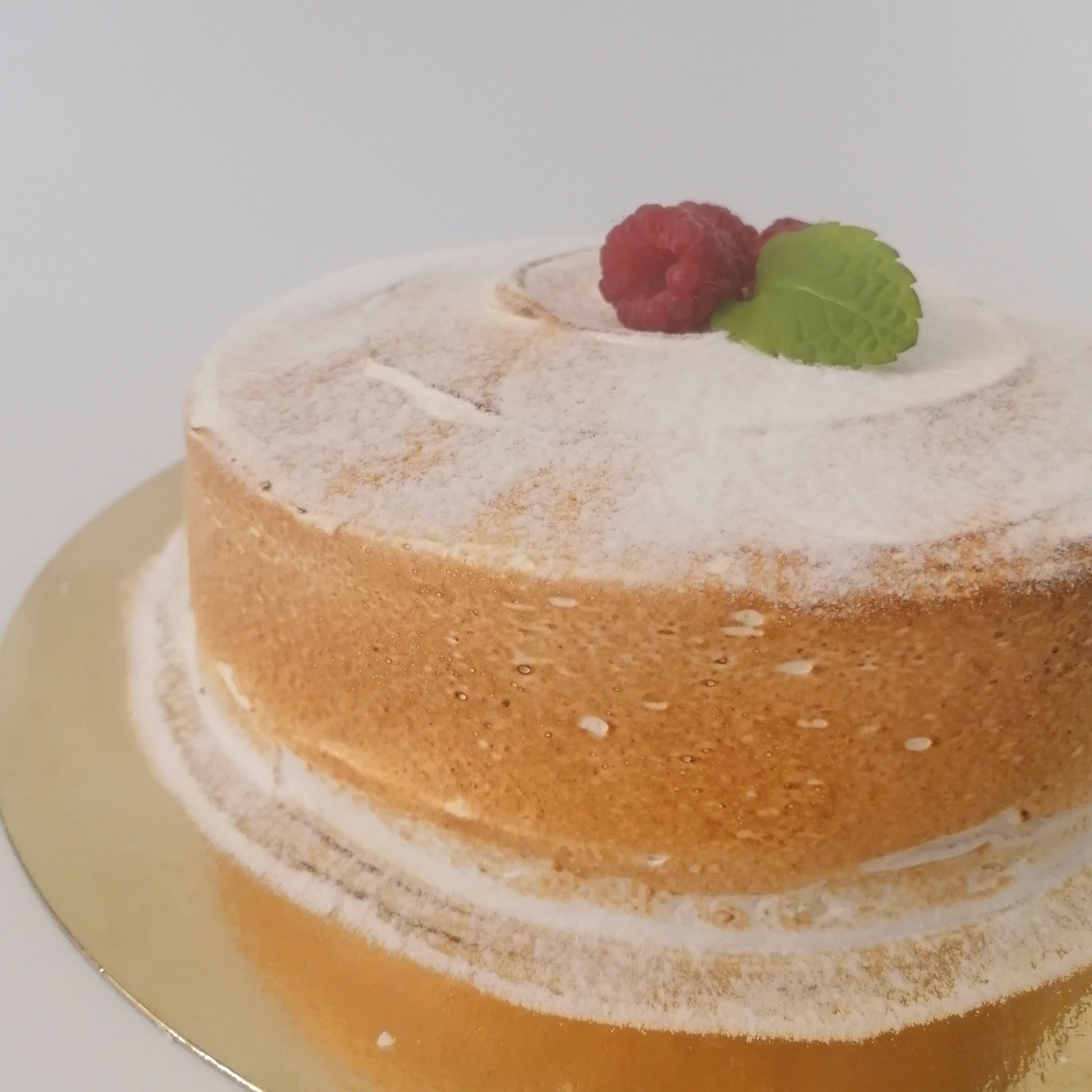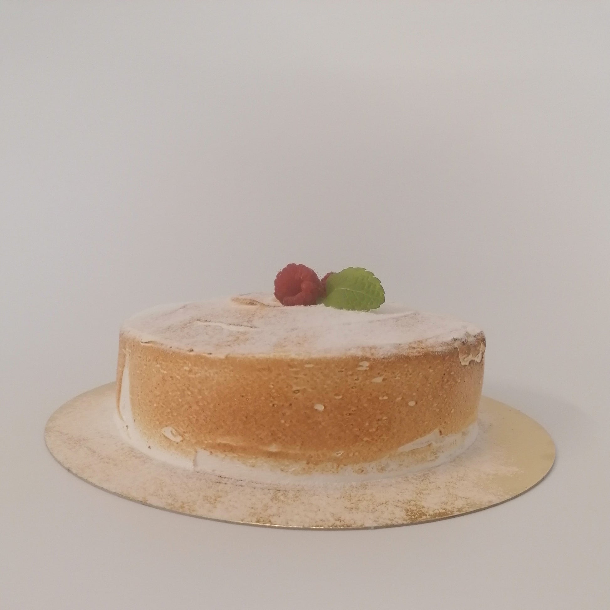 luchtige biscuit met stukjes framboos, afgewerkt met Italiaans schuim.