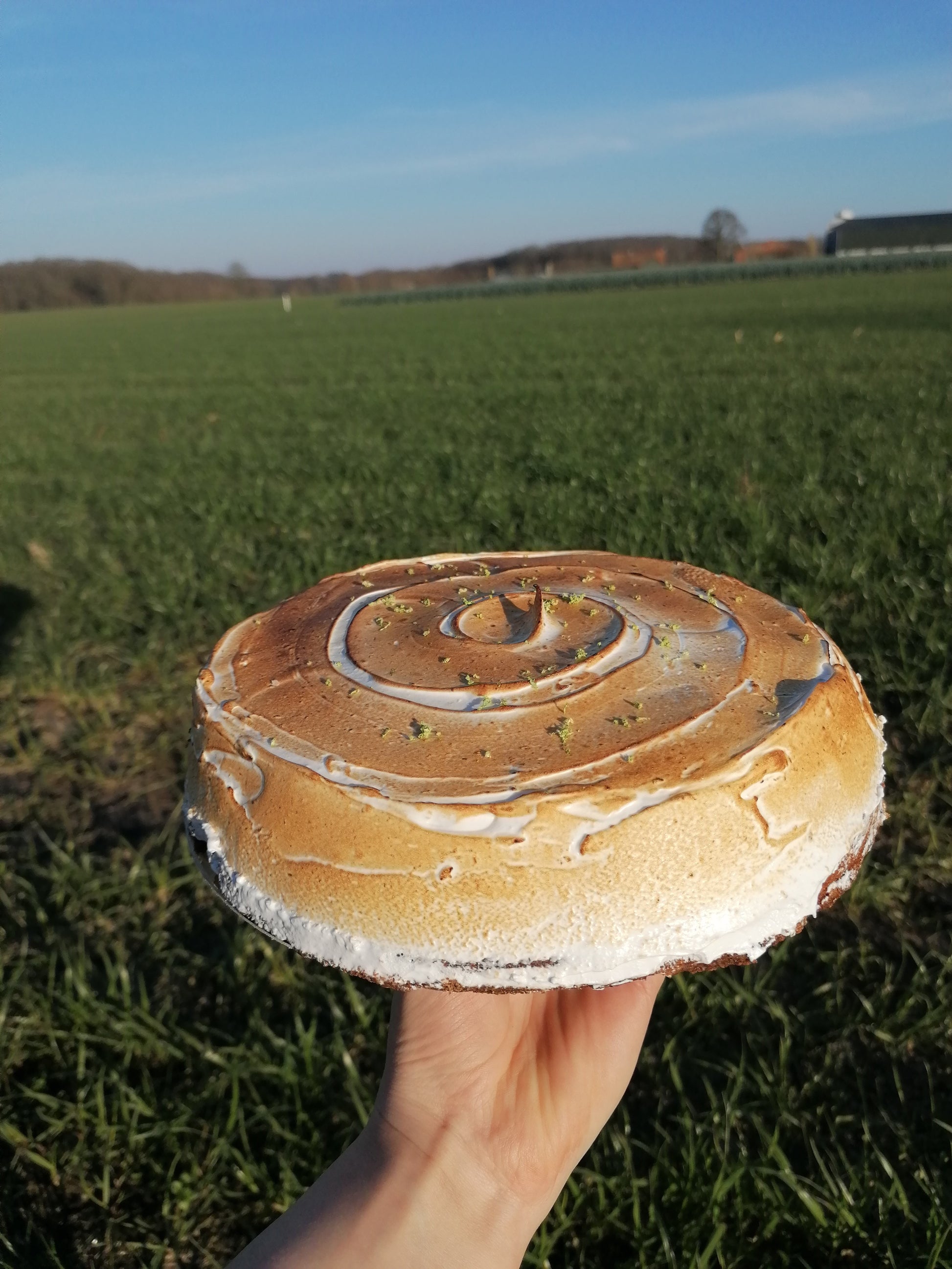 Bodel van Bretoenszanddeeg, vulling van citroen-limoen, dun laagje biscuit en afgewerkt met afgebrand schuim.